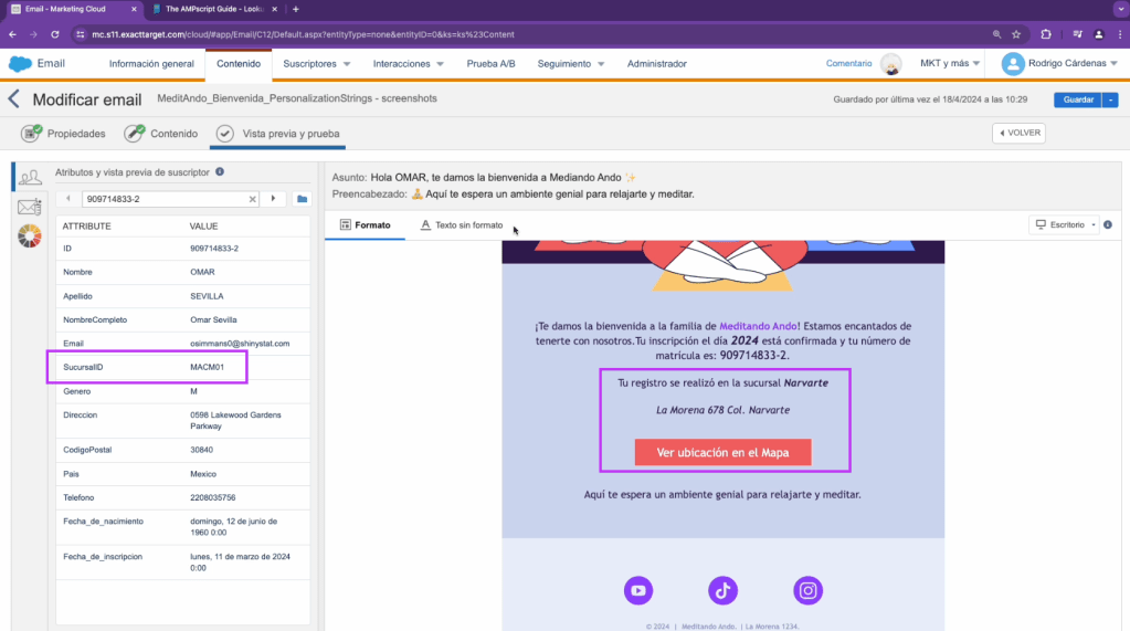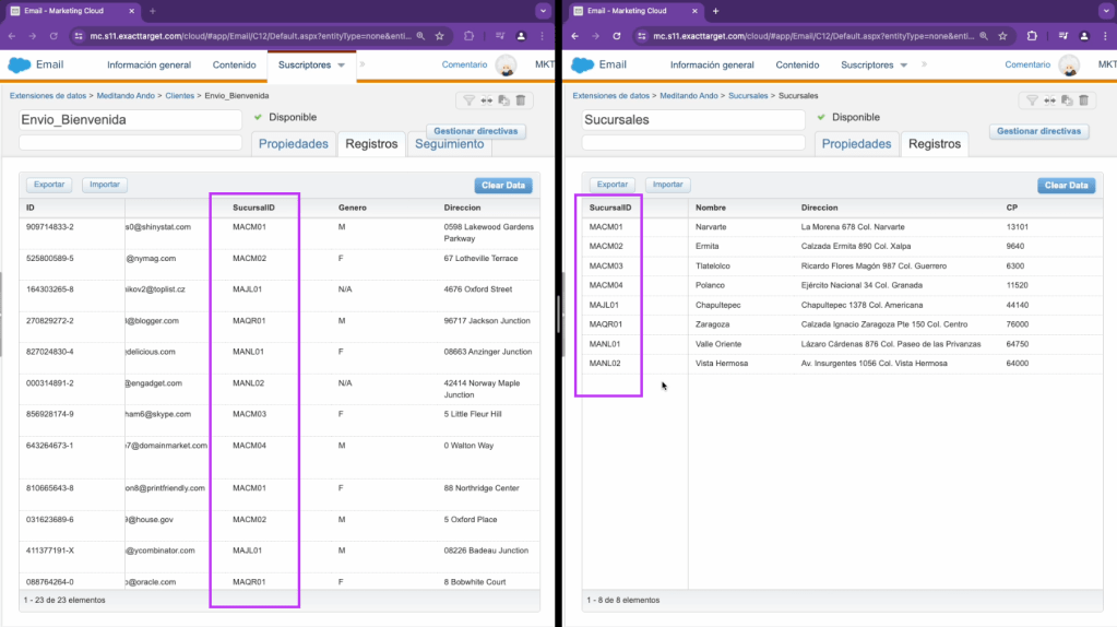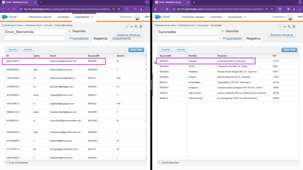 Imaginemos que estamos ejecutando una campaña de correo electrónico para darle la bienvenida a nuestros clientes específicos de cada sucursal. Por un lado, tenemos en nuestra Data Extension de envío un campo llamado «SucursalID», que contiene el ID de la sucursal a la cual está inscrito cada cliente. Por otro lado, tenemos una Data Extension con información específica de cada sucursal, como la dirección, el nombre, horarios, un enlace al mapa de ubicación, etc.